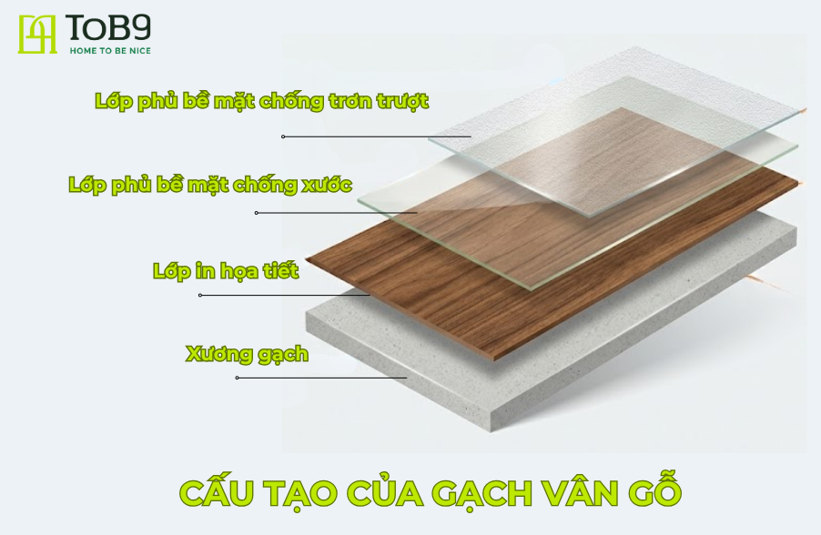 Cấu tạo của gạch vân gỗ gồm 3 lớp chính: Xương gạch, lớp in họa tiết vân gỗ, lớp men phủ bề mặt:  chống xước, chống trơn trượt