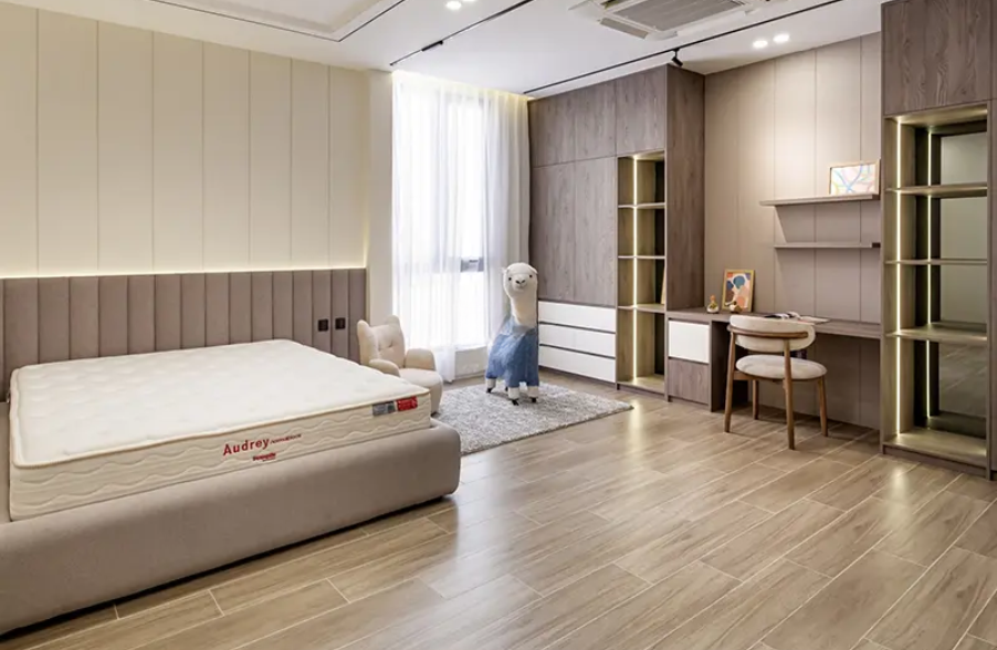 • Phòng ngủ: cần mang lại cảm giác ấm áp, thư giãn, nên chọn vân gỗ màu sáng hoặc tự nhiên (be, vàng nhạt, xám sáng) để tạo cảm giác rộng rãi, bề mặt gạch mịn hoặc matt giúp đi lại thoải mái, dễ chịu.