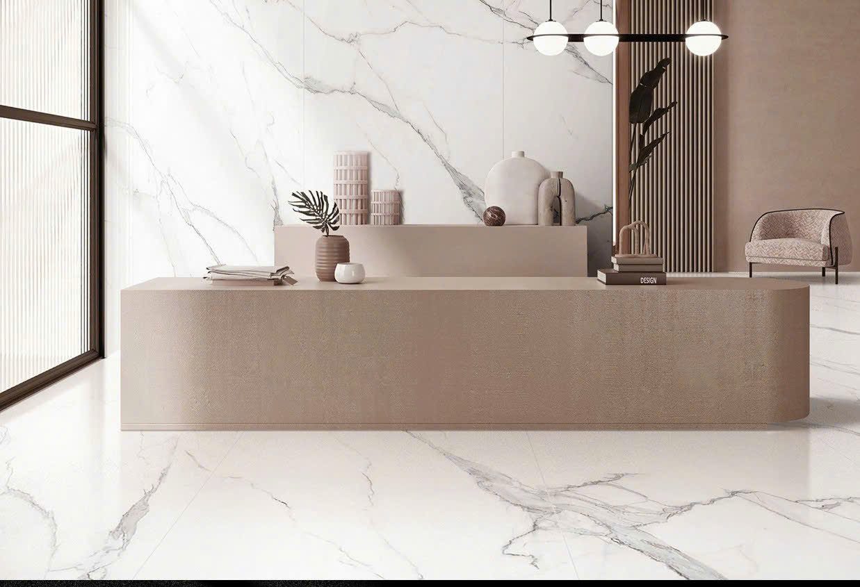 - Tối ưu tính thẩm mỹ hiện đại: Bề mặt gạch bóng mịn, ít đường ron (mạch gạch), mang lại cảm giác tinh tế, liền mạch. Kết hợp với sắc trắng vân đá nhẹ nhàng, Greece Trắng toát lên vẻ đẹp thanh lịch, rất phù hợp với xu hướng thiết kế nội thất cao cấp hiện nay.