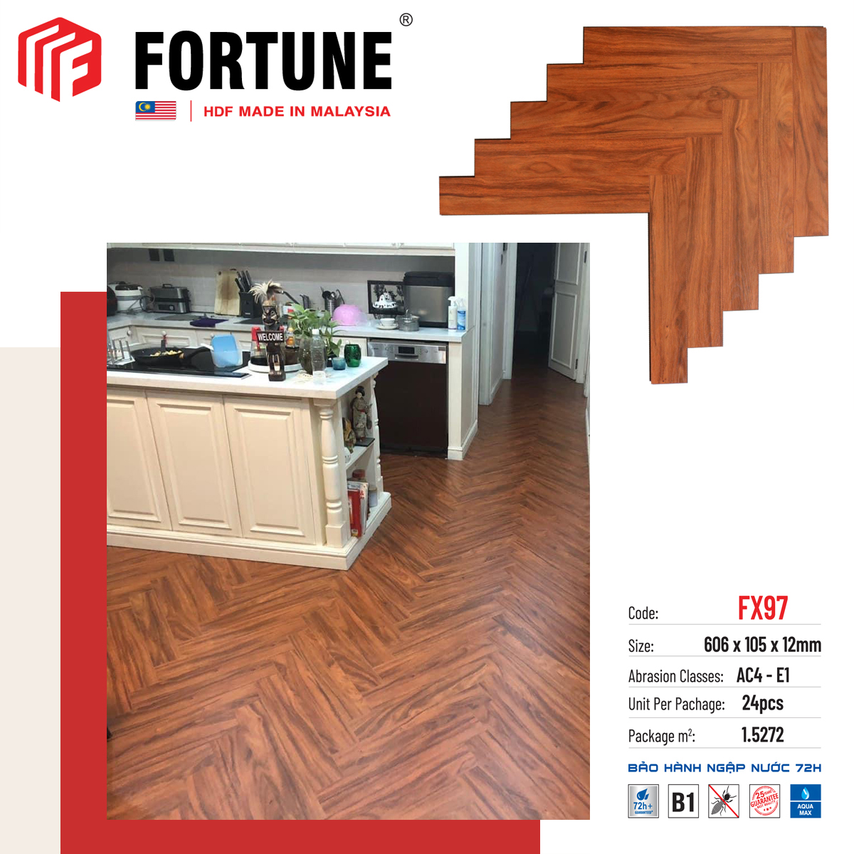 Sàn gỗ xương cá Fortune được thiết kế với 100% cạnh kèm V với công nghệ hèm khóa hiện đại Uni-Click/interlock. Điểm đặc biệt này giúp mang lại sự chính xác trong cách mối liên kết, đảm bảo độ bền cao hơn, không hở mạch. Yếu tố đặc biệt quan trọng giúp ván gỗ Fortune có sự an toàn, thân thiện với môi trường mà vẫn có độ bền cao chính là lớp ván gỗ. Fortune sử dụng lớp ván gỗ được làm từ những cây gỗ rừng nhiệt đới, tuổi thọ cao.